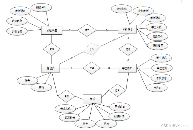 下面是整个考试及其自动评卷系统中主要的数据库表总E-R实体关系图。