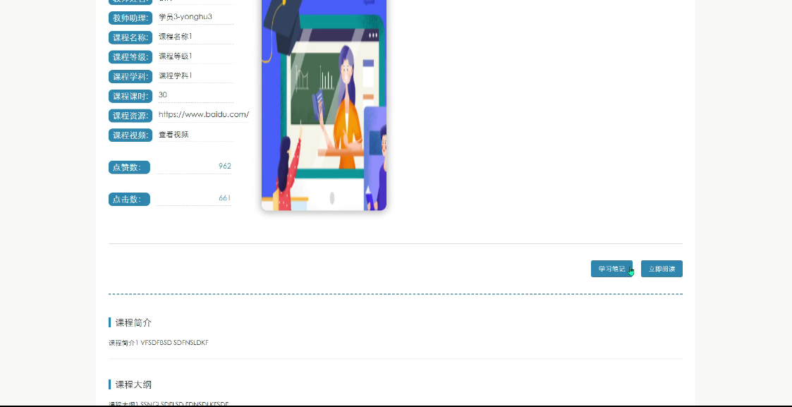 - 课程信息:提供课程信息展示,支持关键字、排序搜索,学员用户可以浏览课程信息,并点赞、收藏和评论课程信息,点击课程资源链接可直接跳转至链接页,详情页还提供学习笔记、立即阅读功能。