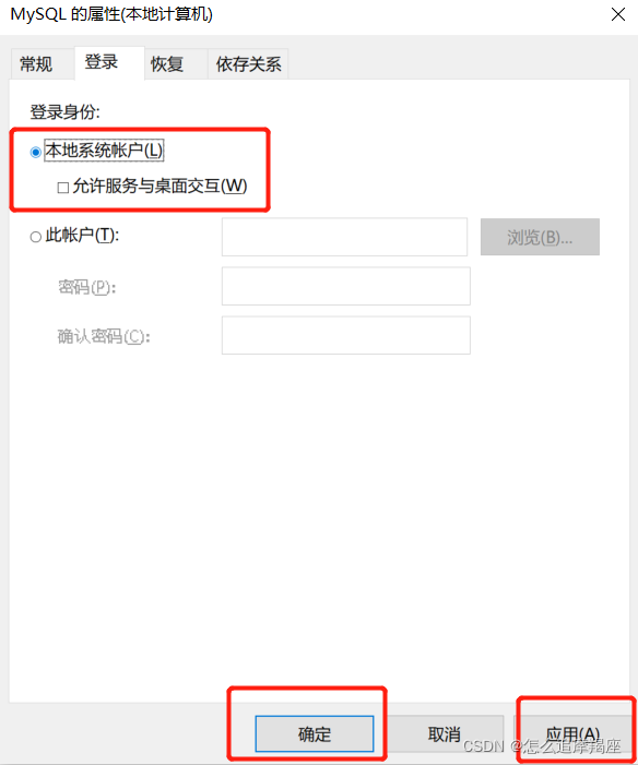 3、双击“MySQL”,“登录”,选择“本地系统账号”,“应用”,“确定”