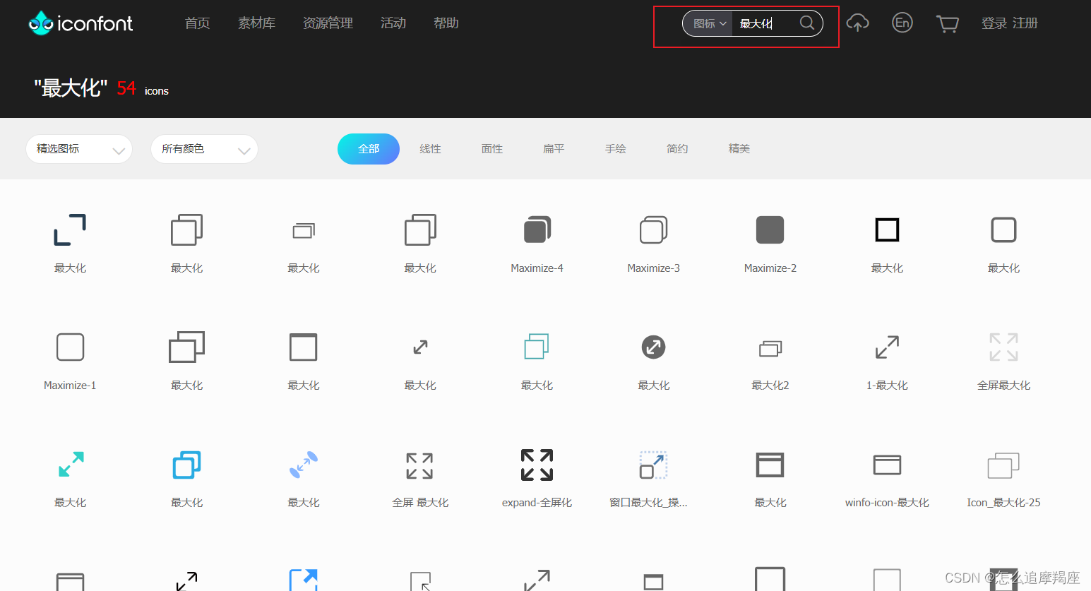 点击上面的链接,在打开的网页中搜索自己要使用的图标,如:最大化