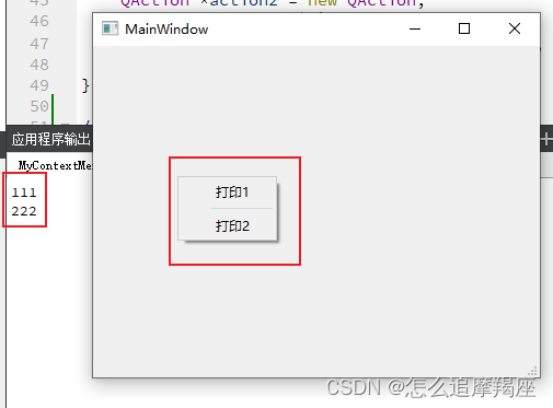 说明:使用四种方式实现鼠标右击界面,显示出菜单,菜单上有两个动作,选择两个动作,分别打印“111”和“222”。