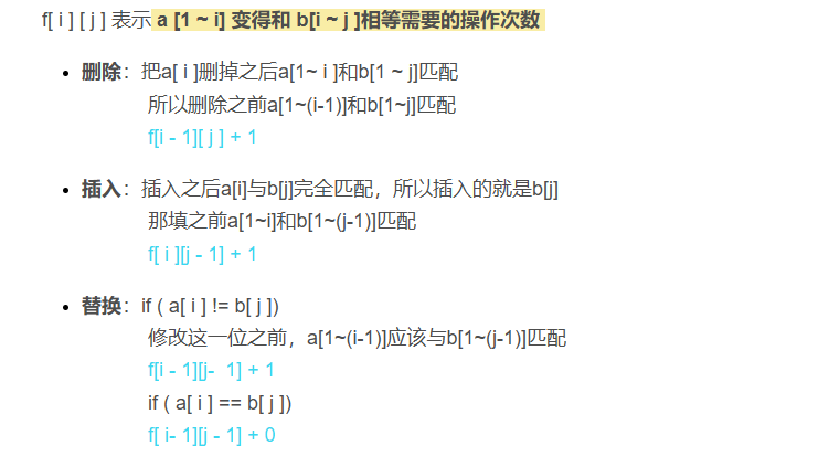 最短编辑距离:递推公式详解 修改这一位之前,a[1~(i-1)]应该与b[1~(j-1)]匹配。所以删除之前a[1~(i-1)]和b[1~j]匹配。那填之前a[1~i]和b[1~(j-1)]匹配。a [1 ~ i] 变得和 b[i ~ j ]相等需要的操作次数。:把a[ i ]删掉之后a[1~ i ]和b[1 ~ j]匹配。:插入之后a[i]与b[j]完全匹配,所以插入的就是b[j]现在请你求出,将 A 变为 B 至少需要进行多少次操作。具体分析过程见下图(图源自y总)f[ i ] [ j ] 表示。一定要考虑a或b为空的情况。