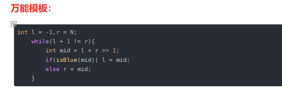 二分查找:万能模板及详细例题 将木头按长度l切,使所有的木头切完后可以正好有k段,l越大越好,因此本题应该从l出发,枚举每种l的可能,找到恰好是不满足题意的那个点。:int: 2的30次方 long long:2的60次方,因此count需要开long long。要找到x的起始位置和结束位置,也就是要找到第一个不 x。思路:转换为A = B + C,枚举B,然后在数组中找A是否存在。方法1:枚举搬走哪块石头,但选择太多,一定会超时。方法2:枚举答案,即枚举最小跳跃距离,二分答案例题5:P2678-跳石头。
