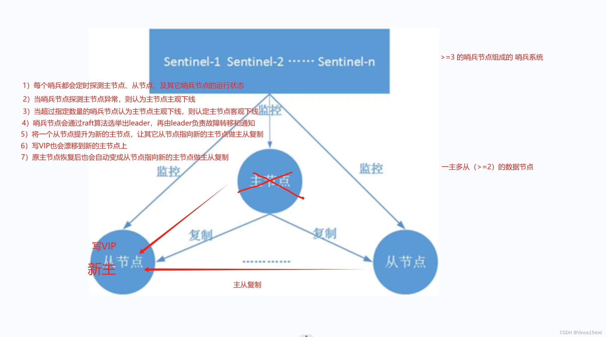 每个哨兵会定时探测主节点,从节点及其他烧饼节点的状态,当哨兵探测倒主节点异常,会认定为主观下线,当超过指定数量的哨兵节点认为主节点主观下线,就会判定为客观下线,哨兵节点通过raft算法选举出leader,由leader负责故障转移和通知,再将一个从节点提升为新的主节点,让其他从节点指向新的主节点做主从复制,vip也会飘移到新的主节点,原来的主节点恢复后会自动变成从节点向新的主节点做主从复制。