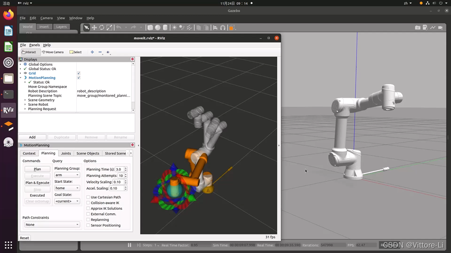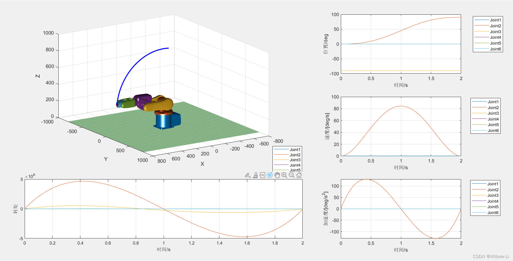 MD-H模型运动学正解、逆解及姿态角的解算验证 文章目录前言一、MD-H模型正运动学验证二、RPY姿态角解算验证三、MD-H模型逆运动学验证前言记录修正D-H模型正运动学、RPY、逆运动学解算的验证过程一、MD-H模型正运动学验证%% 正运动学验证clear;clc;close all;%%杆长参数设置L1=160;L2=449.5;L3=580;L4=200;L5=640;L6=228;d1=L2;a2=L1;a3=L3;a4=L4;d4=L5;d6=L6;%初始角设置theta1=10;theta2=20;theta3=3.