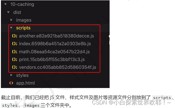 目前,全部 js 文件都在 dist文件夹根目录下,我们尝试把它们放到一个文件夹中, 这个其实也简单,在输出配置中修改 filename,即output.filename加上scripts前缀即可汇总js文件至指定文件夹下生成。