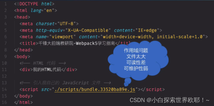 - 在没有各个 webpack 搭建的脚手架(create-react-app、vue-cli 等等)之前,我们通过在 HTML5 文件里引入一个个 Javascript 文件来进行开发,这就可能导致并行请求数量过多、存在重复代码等问题。