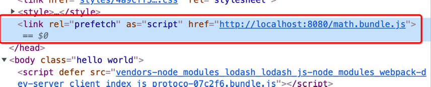 加上注释 webpackPrefetch: true 后,可以告诉 webpack 执行预获取。会生成<link rel="prefetch" href="main.js">并追加到页面头部,指示着浏览器在闲置时间预取 math.js 文件。