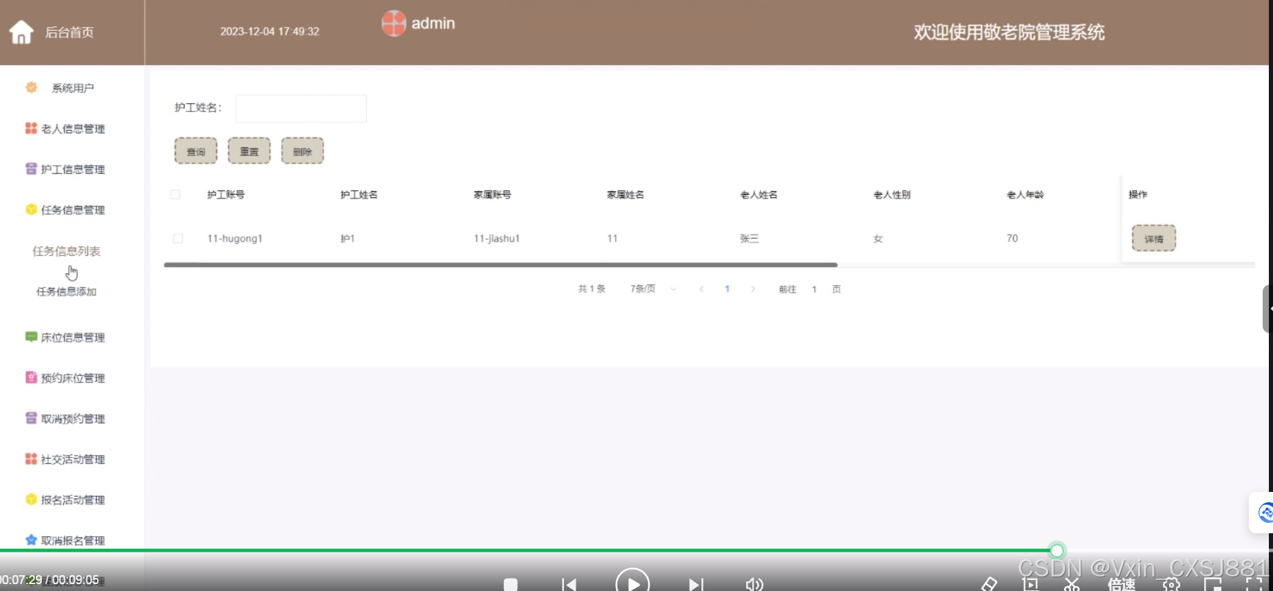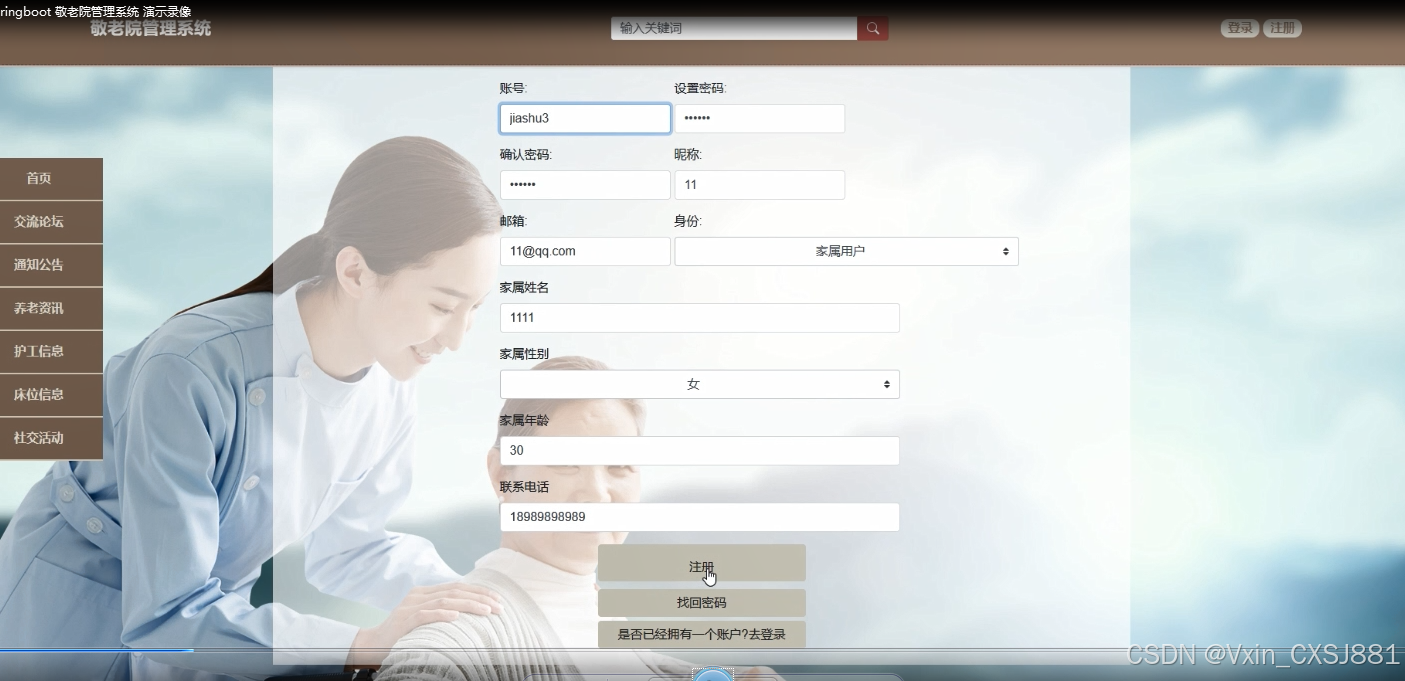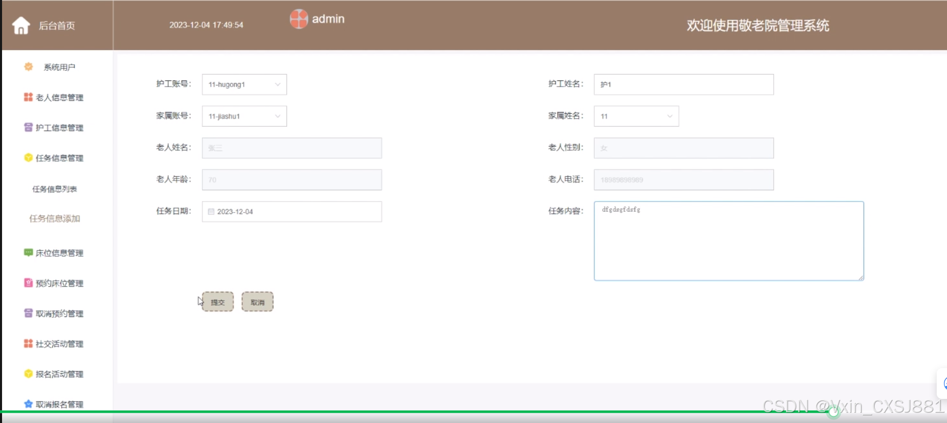 The system includes functional modules such as homepage, system users, elderly information management, caregiver information management, task information management, bed information management, reservation bed management, cancellation reservation management, social activity management, registration activity management, cancellation registration management, health information management, etc., aiming to achieve informatization, standardization, and scientificization of nursing home management. The system communicates with the server through a browser to achieve data exchange and change. You only need to use a computer and move your fingers to operate the system, achieving data communication management. The entire system design process fully considers issues such as data security, stability, and reliability, and the operation process is simple. This system improves work efficiency and reduces errors and omissions in data storage through scientific management and convenient services.