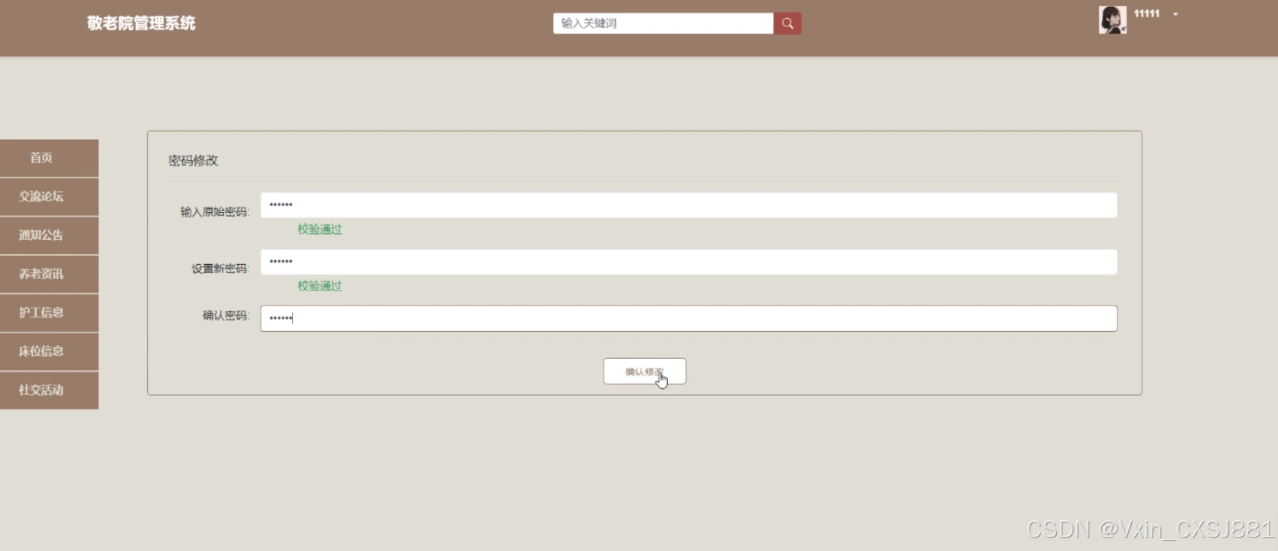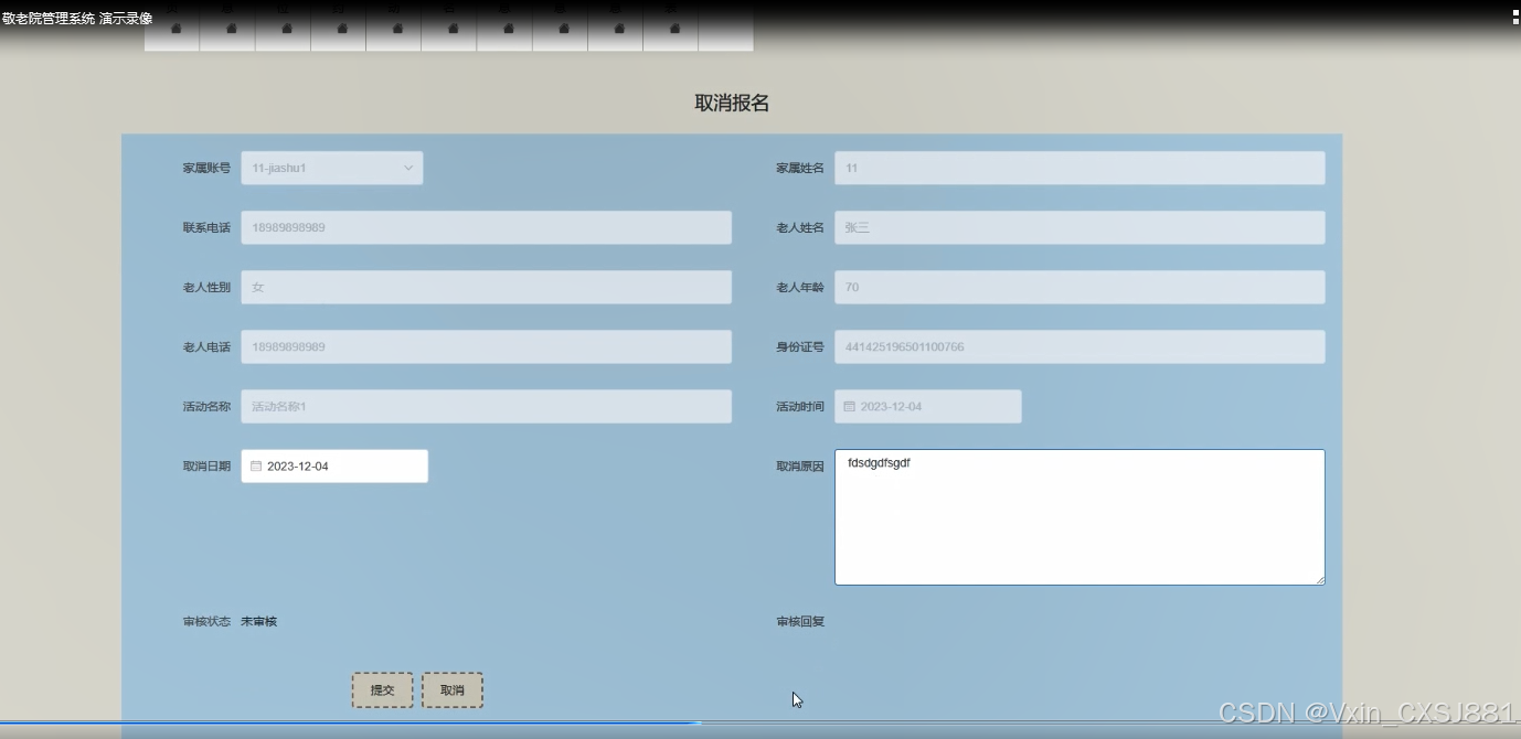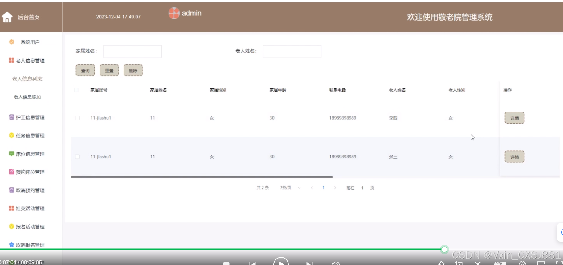 The system includes functional modules such as homepage, system users, elderly information management, caregiver information management, task information management, bed information management, reservation bed management, cancellation reservation management, social activity management, registration activity management, cancellation registration management, health information management, etc., aiming to achieve informatization, standardization, and scientificization of nursing home management. The system communicates with the server through a browser to achieve data exchange and change. You only need to use a computer and move your fingers to operate the system, achieving data communication management. The entire system design process fully considers issues such as data security, stability, and reliability, and the operation process is simple. This system improves work efficiency and reduces errors and omissions in data storage through scientific management and convenient services.
