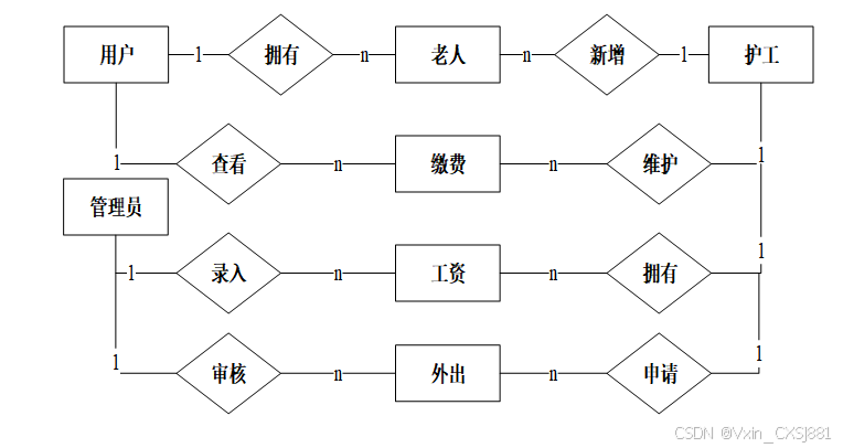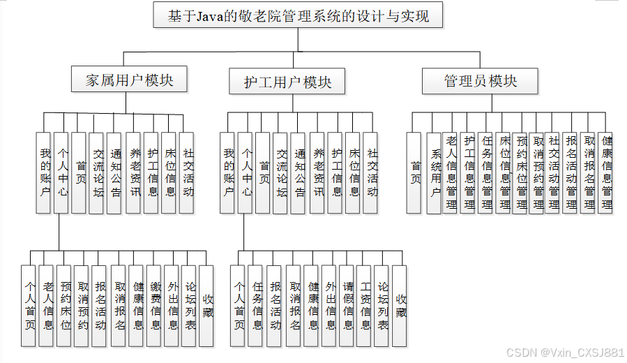 敬老院管理系统在对需求做解析后,整个系统主要分为两个部分:管理员和家属用户、护工用户,每个模块下的分支功能不一样。对功能做出如下说明: