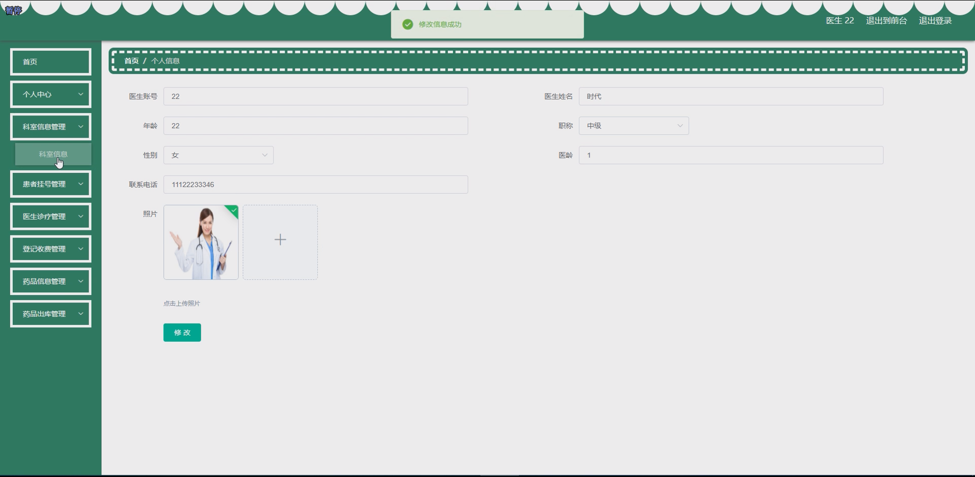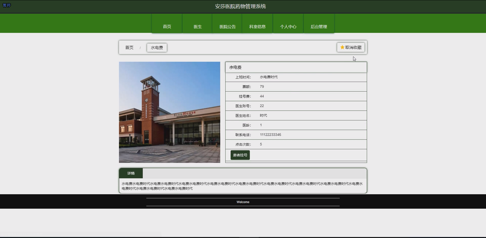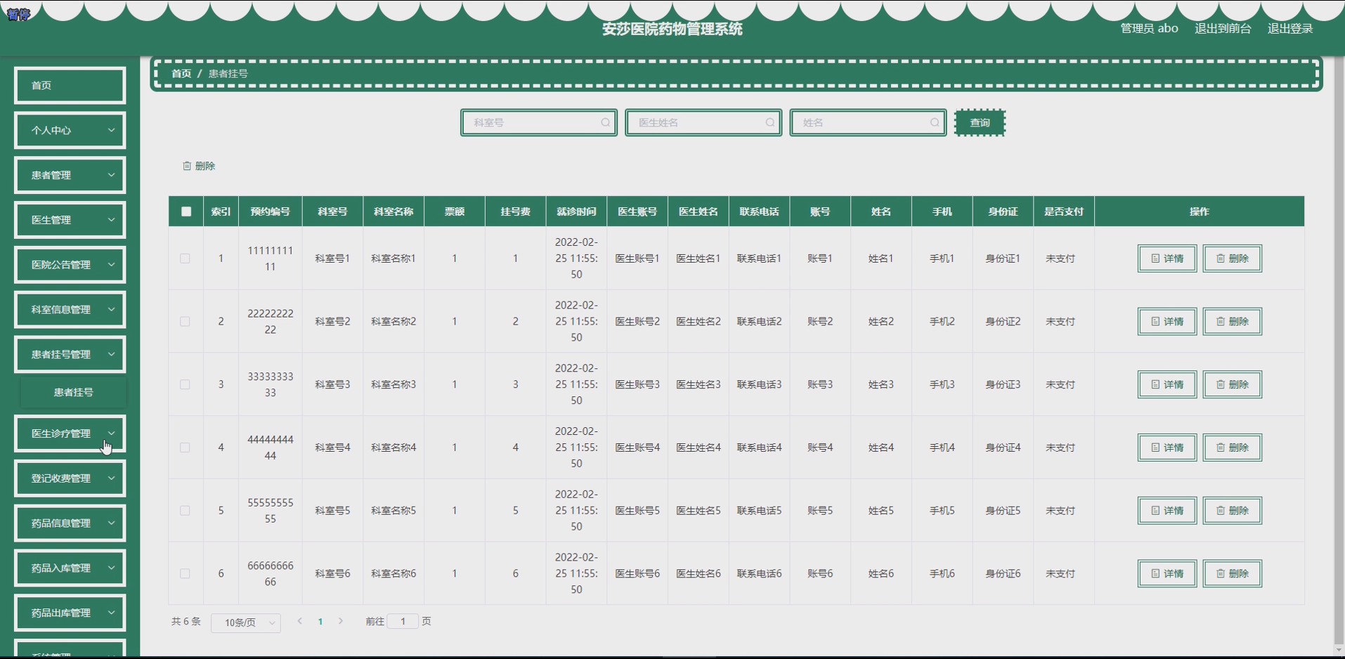 患者,医生,科室信息,预约挂号,药品信息,药品入库,药品出库,医生诊疗,登记收费,医院公告,取消预约,用户评价