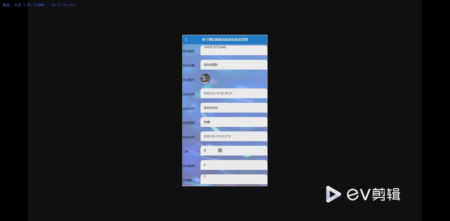 - 活动信息模块:管理员发布活动信息(活动名称、类型、时间、地点、人数限制、活动详情等),支持活动信息编辑、删除、置顶;用户可在微信端查看活动列表、活动详情。