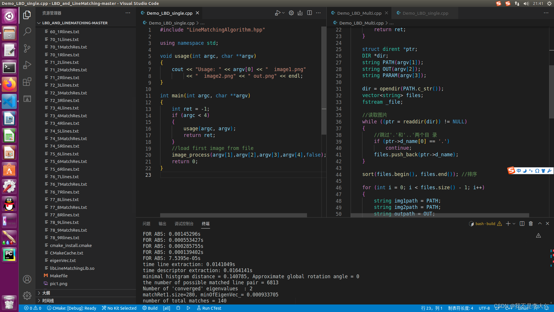 本文介绍了使用LBD线特征提取算法进行图片线特征匹配的过程。首先,详细记录了单张图片线特征匹配的编译及运行步骤,包括解决的错误问题和运行结果展示。接着,演示了如何进行批量图片线特征匹配,通过指定输入和输出路径实现多张图片的处理。最后,总结了整个操作流程,为后续学习者提供了参考。
