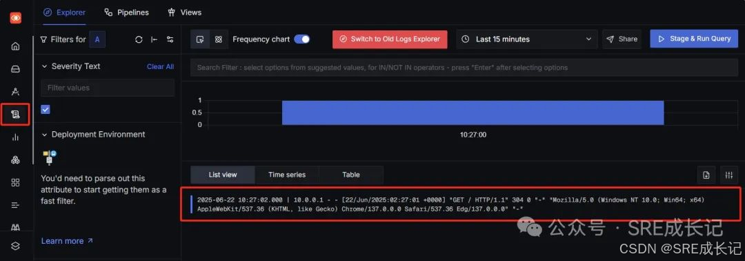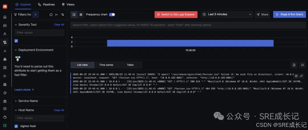 在浏览器访问一次nginx,signoz采集到了1条日志。在这里需要注意的是nginx其实在接入signoz之前已经测了很多次,有了很多条访问日志。但这里将日志成功接入signoz之后,不会采集之前的日志,只会从接入之后的日志开始采集。