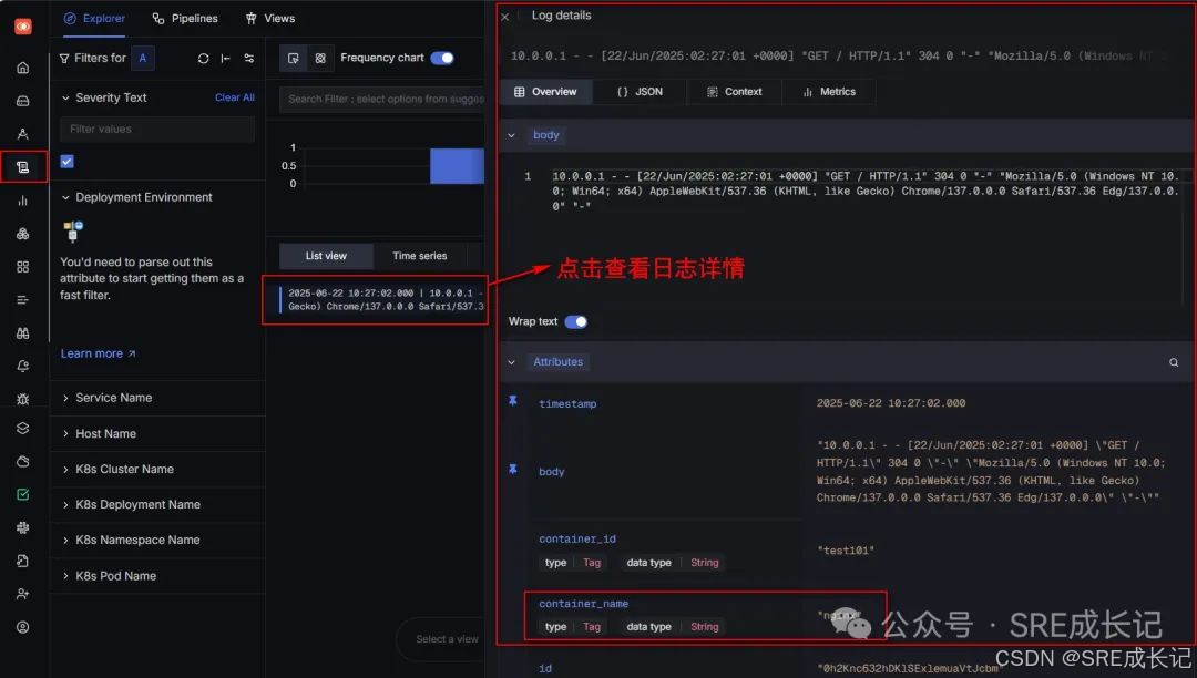 再行查看signoz的日志界面,已能看到刚刚的日志了: