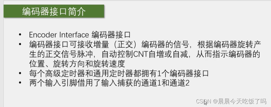 - 在单片机中,只有高级定时器和通用定时器有编码器接口,但如果一个定时器被配置成编码器接口模式,其他工作基本无法进行,编码器接在每个定时器的CH1和CH2通道,CH3和CH4不能接编码器。
