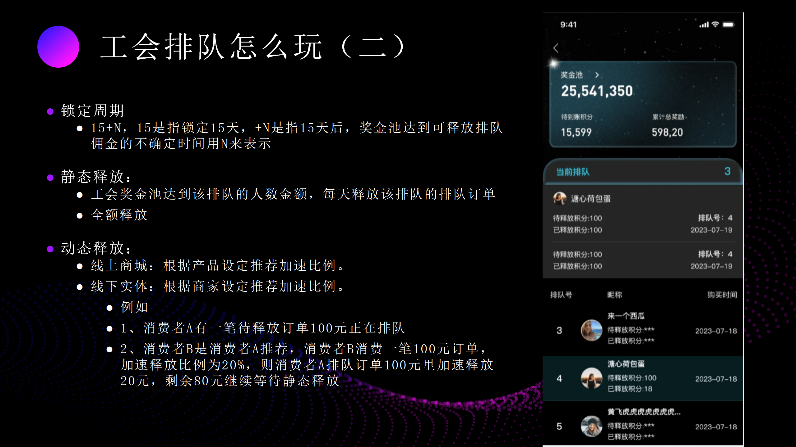 静态与动态释放机制:静态释放是根据设定的排队人数金额目标,每天释放一笔订单的金额给排队中的消费者,按照排队顺序依次获得返现金额;动态释放则是消费者通过推荐他人参与工会排队模式,可以加速释放部分订单金额,通过推荐加速比例可以更快地获得自己的返现金额。