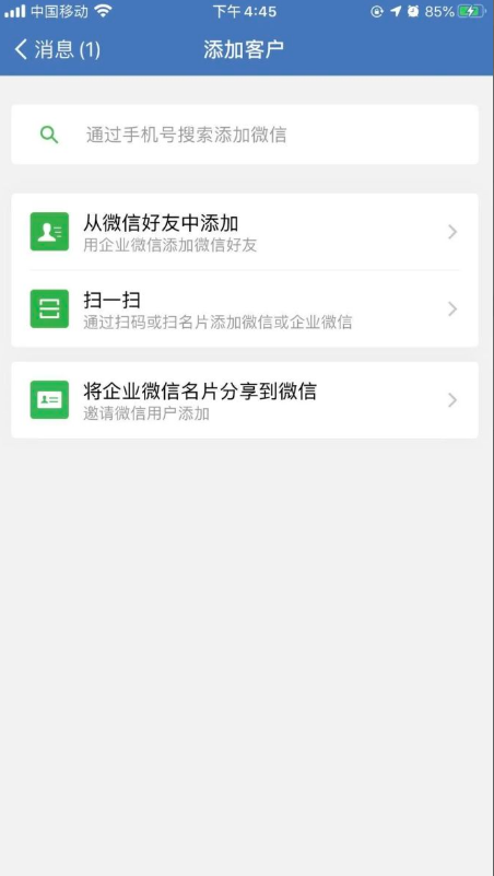 通过微信注册的企业微信,可以从企业微信APP中打开“加微信”,然后会出现企微添加客户的4种方式: 从微信好友中添加、扫一扫、将企业微信名片分享到微信,还有一个通过手机号搜索添加微信。