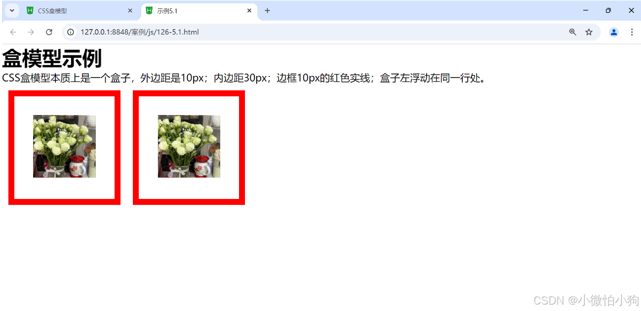 <p>CSS盒模型本质上是一个盒子,外边距是10px;内边距30px;边框10px的红色实线;盒子左浮动在同一行处。</p>