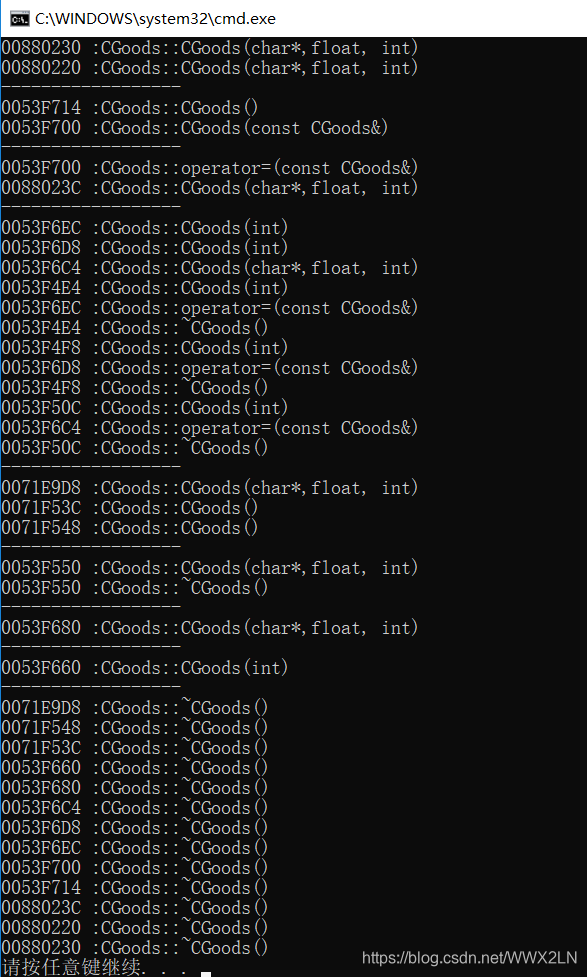 std::cout << this << " :CGoods::CGoods(const CGoods&)" << std::endl;