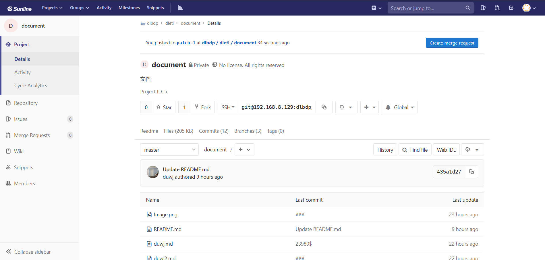 之后,两种方式下项目负责人都可以在项目的gitlab主页上看到每个开发人员的工作进度,并考虑何时merge开发人员的分支到master分支上以完善项目。