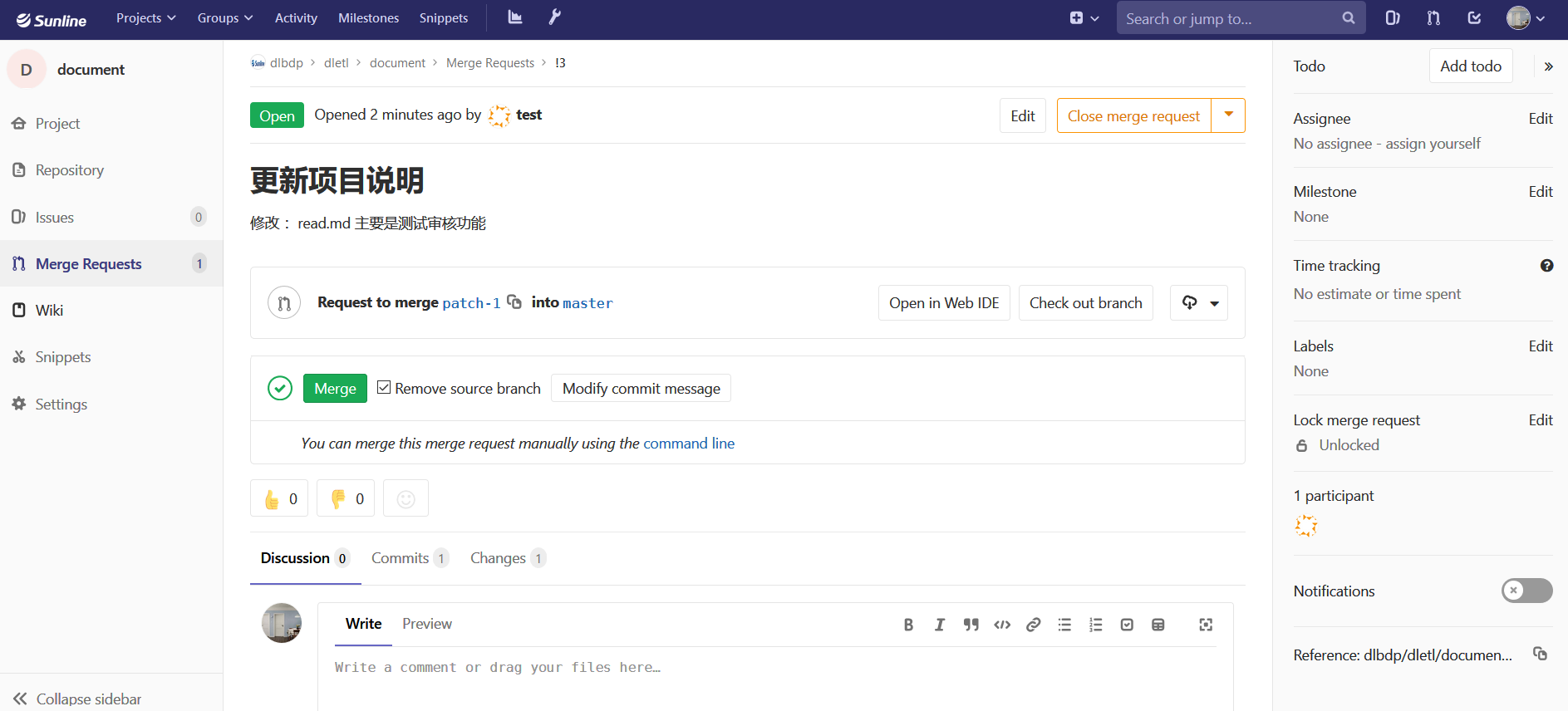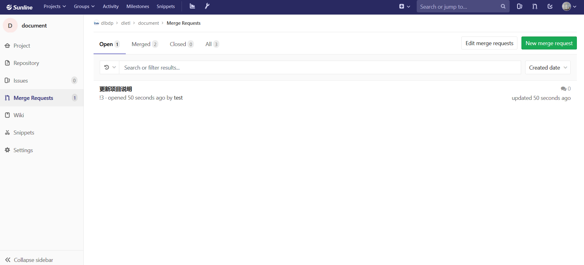当有新的代码提交请求时,项目负责人可以通过查看merge requests获取到来自fork或者branch的合并请求: