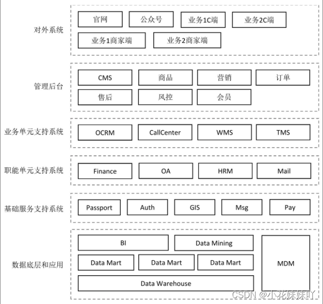 例如,客服业务要用到Call Center系统,用户账号体系管理要用到Passport系统,仓储业务要用到WMS,配送业务要用到TMS。