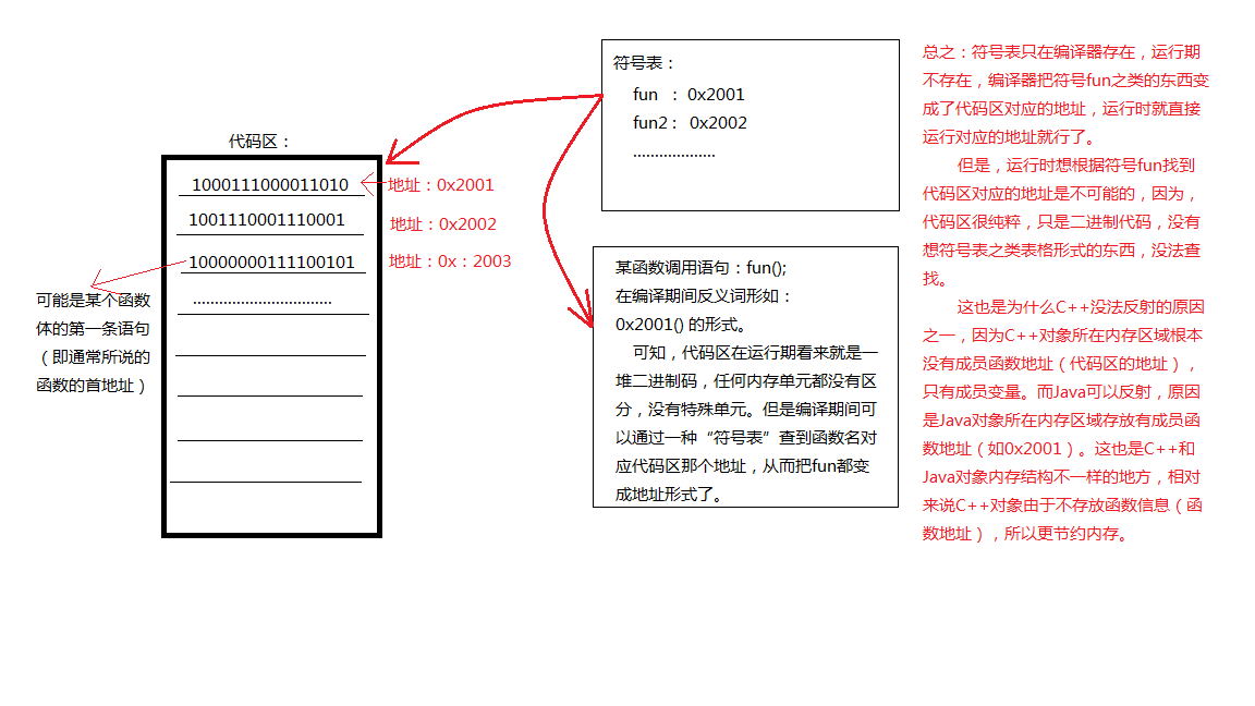 先看编译过程,C++编译器使用符号表,运行时就不用符号表了。符号表简单理解为具有三列的表格(符号名、类型、内容),只有变量、函数和类能进入符号表中,其中类型列对于变量来说是描述该符号怎么分配内存和初始化,类型列对于类来说就是类里面含有什么成员,怎么进行成员初始化,内容列对于变量来说就是变量存放的具体数据(包括对象变量也是),内容列对于函数来说就是函数代码体的首地址,内容列对于类来说是空的,不用的。C++编译每个文件时,第一步从整体上扫描,无非就是声明和定义,把所有定义的东西都装进那个.cpp文件对应的符号表,就产生了符号表;第二步进行局部扫描,也称错误检查,首先进行符号检查,就是扫描函数体和类体,碰到不认识的符号,先看该符号有没有在本cpp文件声明,如果声明了就把当前符号记录成问号(如 普通变量x和对象变量stu翻译如下,x = 15翻译成x? = 15,stu.no =10 0翻译成stu?.第三个内存单元 = 100),如果符号没事先声明,也不在本cpp的符号表里头,那就报错;然后对函数体和类体进行语法错误检查,看看有没有错误的地方;第三步是进行翻译成机器语言,例如把函数名翻译成地址,变量名也翻译成地址等;其中最重要的就是可能把一行的文本代码翻译成很多行的机器代码,例如碰到函数体内使用到new一个类则查找构造函数然后翻译成一堆对对象成员的分配内存指令,碰到使用对象成员变量时翻译成从对象变量首地址开始下移多少个位置才取出具体的数据;另外要注意碰到new的地方都依据符号表的类型列翻译成具体的分配内存和初始化的指令(汇编有具体的指令集,不仅是new,变量定义语句也如此翻译)。总之经过上面三步过程,编译就算完了,其最终结果就是产生了一个符号表和一个.obj文件,其中符号表里都是该cpp文件中定义的全局的东西(变量定义、函数定义或者类定义),obj文件都是函数体(特别注意只有函数体,没有类体,类体中的函数本质也是函数体,只不过具有复姓而已,类体的成员变量此时无用了,已经都翻译成某个对象成员便宜多少位地址形式的东西了,其本质就看成对象变量),该函数体就是所谓的指令,其中函数体里面可能有一堆的含有问号的符号。