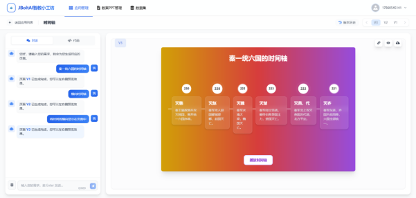 JBoltAI 智教小工坊凭借三大核心优势,成为教师教学的 “智能助手”。其一,零技术门槛,教师无需掌握编程知识,只需用自然语言描述教学需求,如 “生成秦一统六国的时间轴”“设计鸡兔同笼问题求解工具”,AI 就能实时转化为专业教学应用,让技术真正服务于教学;其二,快速落地教学创意,无论是想制作动态历史时间轴,还是开发交互式数学解题工具,教师的创意想法能通过 AI 快速变为实际教学工具,激发学生学习兴趣;其三,多应用与教案管理,平台支持对生成的教学应用、教案 PPT 进行集中管理,提供版本历史追溯(如 V1、V2、V3 版本)与实时预览功能,便于教师快速迭代优化教学内容,解决教学资源分散管理的难题。