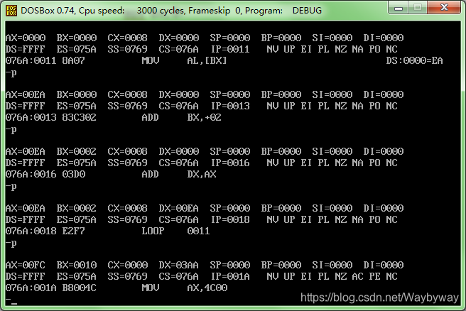 编程序计算ffff:0、2、4、6、8、A、C和E 8个字节型单元中数据的和,将最后结果保存在dx中