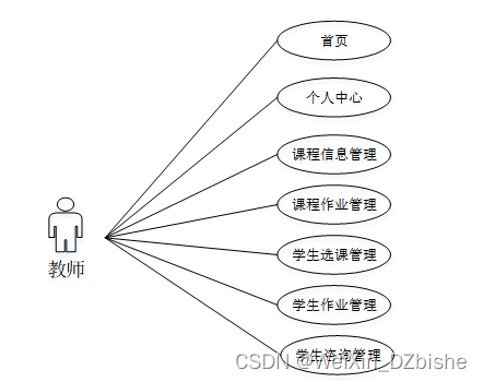 (2)教师:首页、课程信息、学生选课、学生成绩、通知公告等功能。教师用例图如图3-2所示。