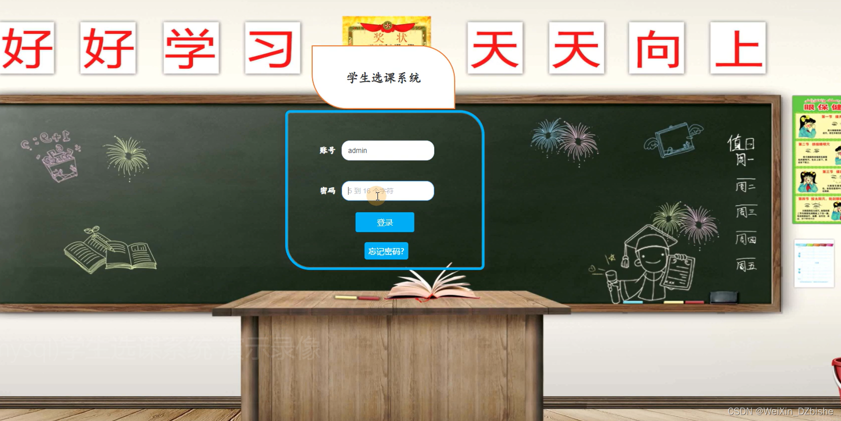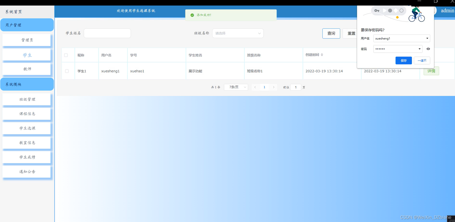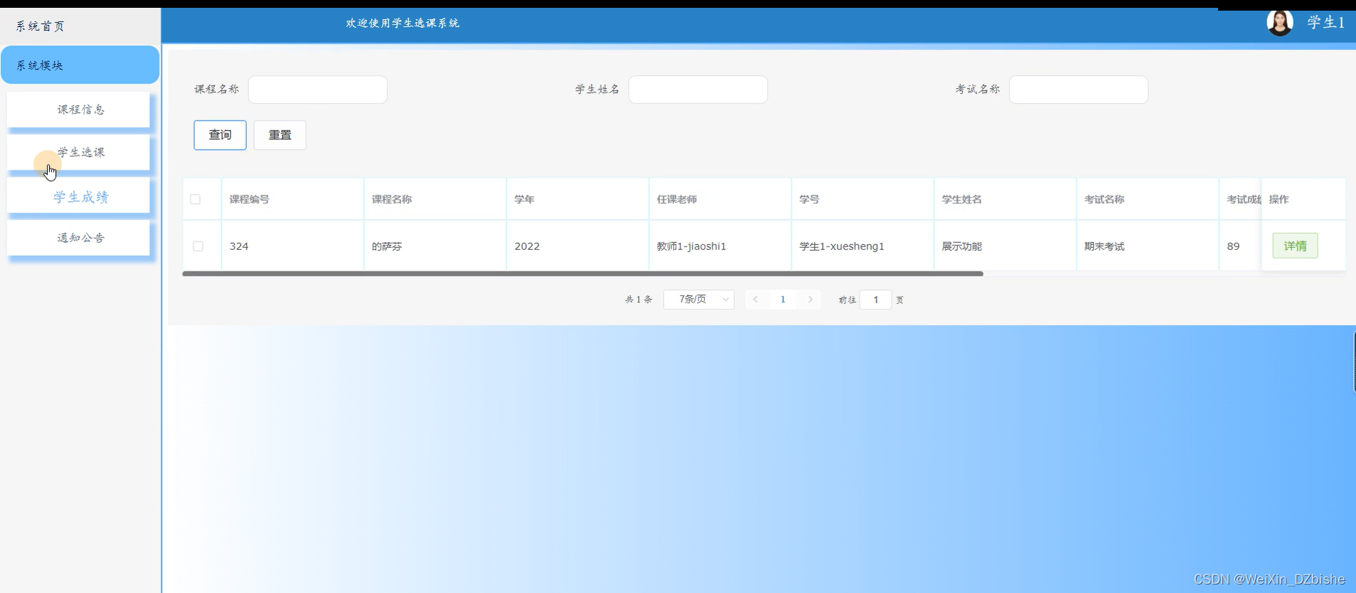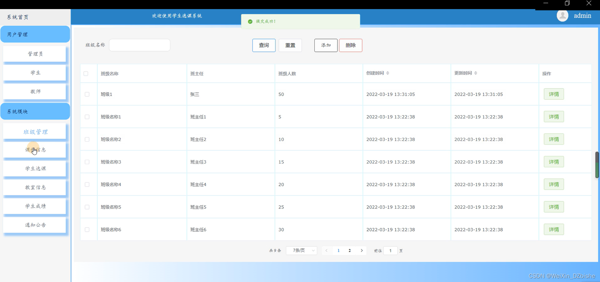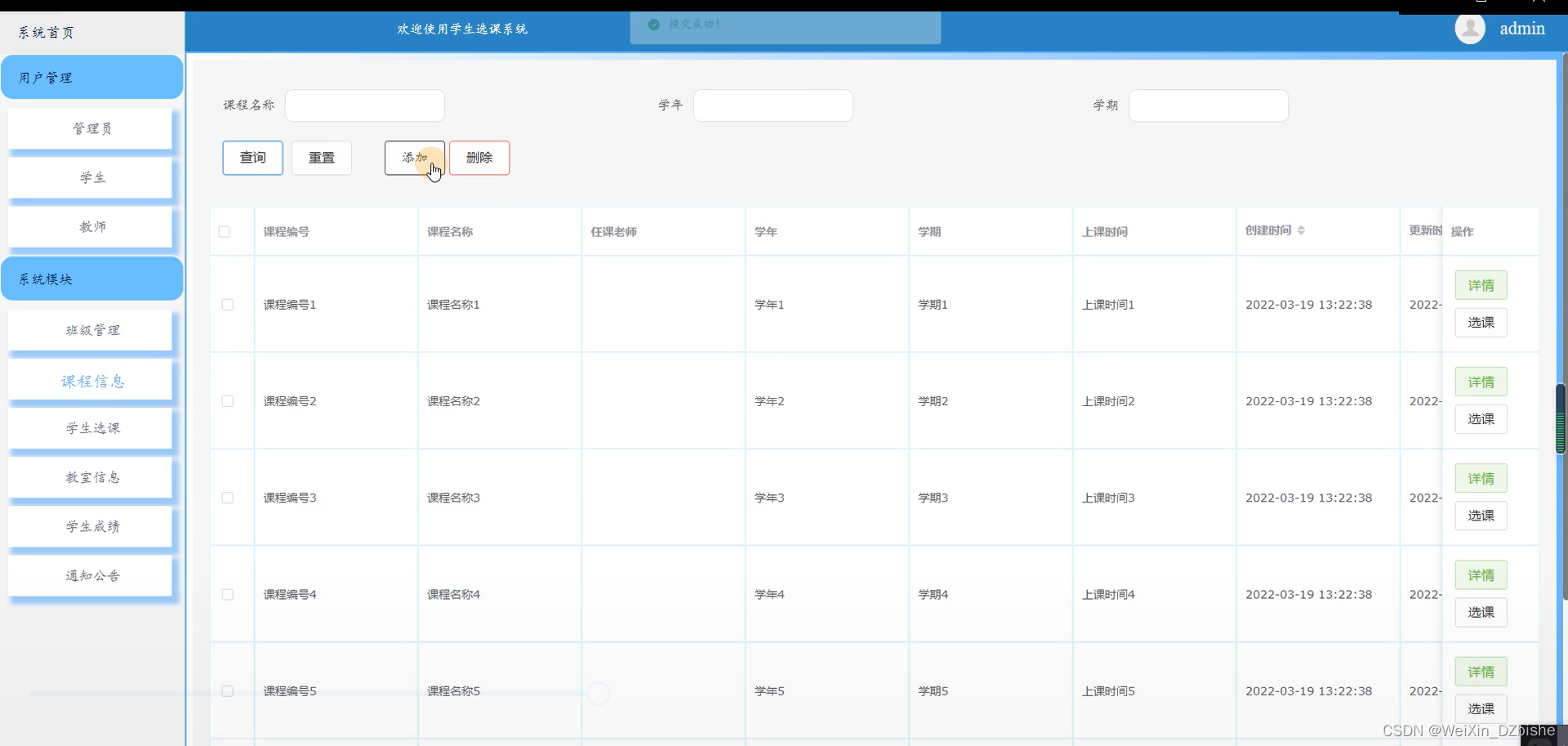 The main users of the student course selection system are divided into students, teachers and administrators. The functions include administrators: home page, user management (administrators, students and teachers) system module (class management, course information, student course selection, classroom information, student achievement, notice announcement) system management, students: home page, course information, student achievement, notice announcement, teachers: home page, course information, student course selection, student achievement Notification and announcement functions. Because the functional module design of this website is relatively comprehensive, the information management process of the whole student course selection system can be realized.
