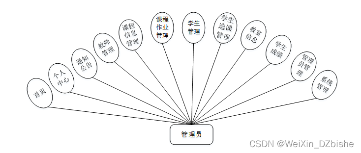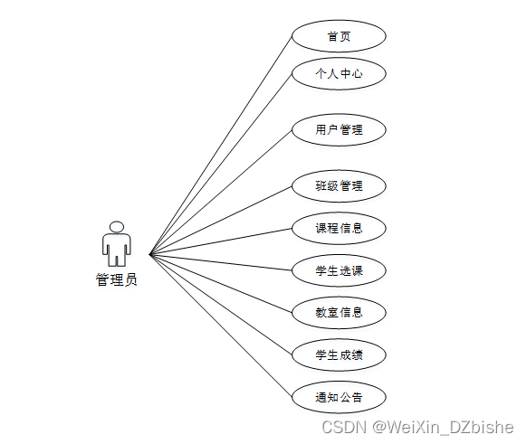 (1)管理员模块:系统中的核心用户是系统管理员,管理员登录后,通过管理员菜单来管理后台系统。主要功能有:首页、用户管理(管理员、学生、教师)系统模块(班级管理、课程信息、学生选课、教室信息、学生成绩、通知公告)等功能。管理员用例图如图3-1所示。