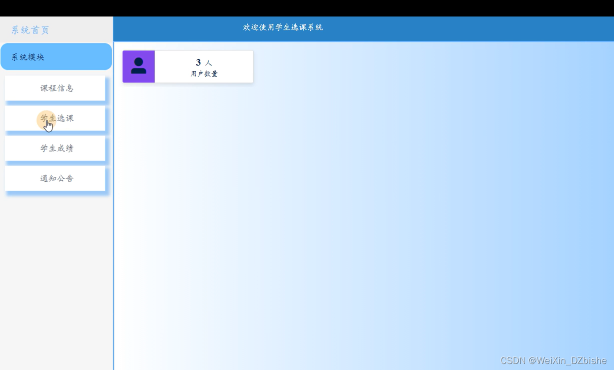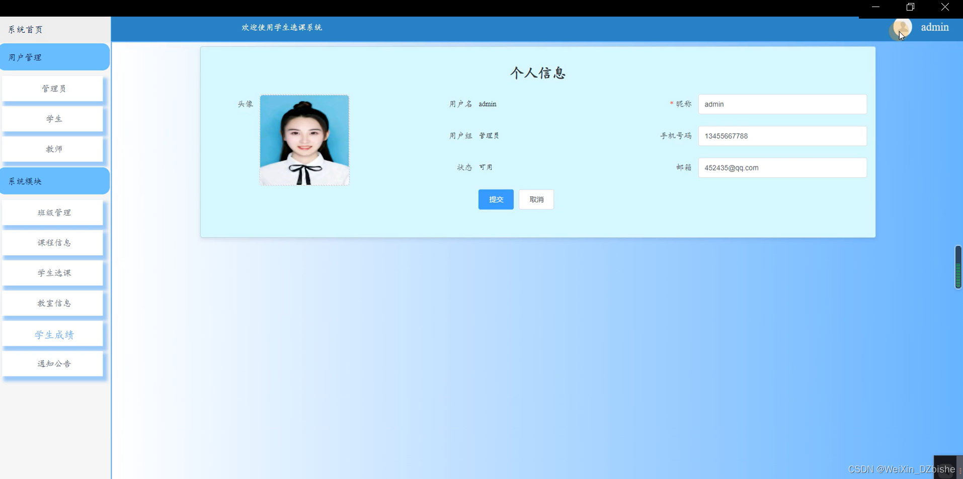 The use of this system can realize the informatization of the management of the student course selection system, facilitate the administrator to manage more conveniently and quickly, and improve the management efficiency of the student course selection system.