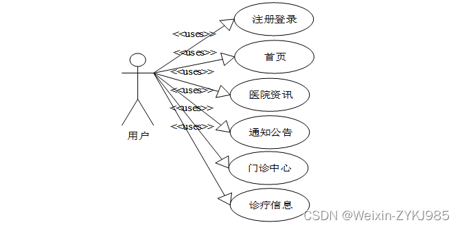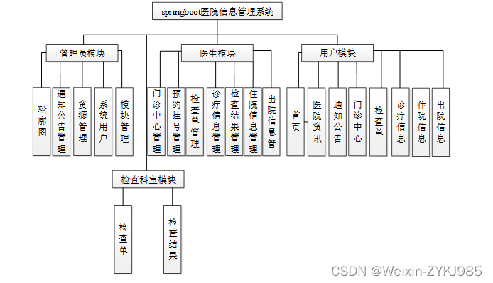 医院信息管理系统的功能主要分为前台用户根据自己的需求进行注册登录,浏览医院资讯并线上进行预约挂号以及门诊缴费操作。后台系统管理员因职责的不同,分为医生和管理员,医生主要对就诊挂号,检查结果,诊疗信息,住院信息,出院信息进行处理,而管理员主要对注册用户,医生信息,科室详细信息,医院资讯,通知公告进行处理。还有检查科室负责对检查单和检查结果进行处理。