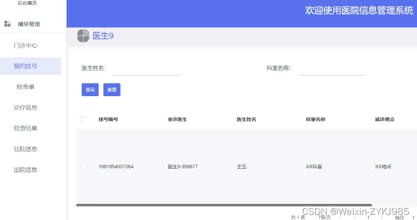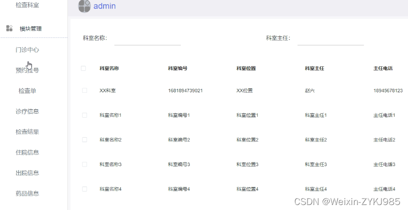 模块管理:管理门诊中心,预约挂号,检查单,诊疗信息,检查结果,住院信息,出院信息,药品信息,科室信息等模块的添加,查询和删除操作。