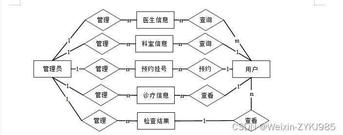 从前面可以分析到数据库中最重要的是门诊中心,科室信息,预约挂号,诊疗信息,检查结果、科室信息。分析可以得到如下数据描述: