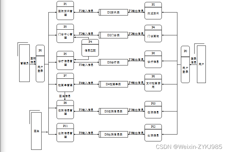 对系统的数据流进行分析,系统的使用者分为二类,一般用户(患者用户、医生),管理员。系统主要对界面信息传送,登录信息的验证,注册信息的接收,用户各种操作的响应做处理。