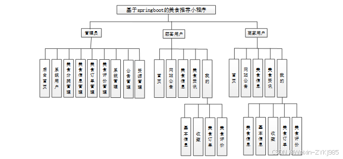 通过对基于springboot的美食推荐小程序的功能需求分析以及用例分析,得出了基于springboot的美食推荐小程序的功能模块图如图3-1所示。