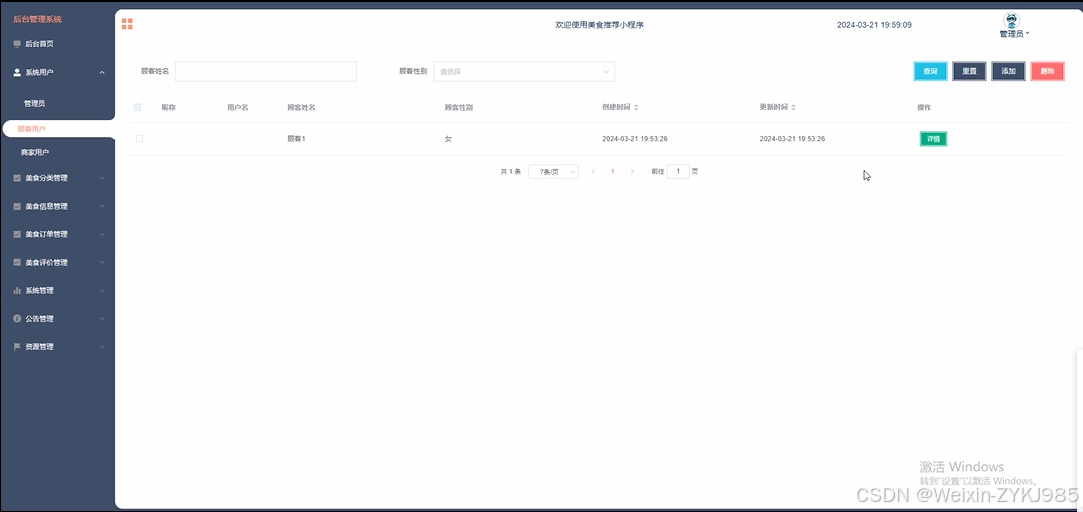 基于springboot的美食推荐小程序划分了微信小程序顾客用户端和商家用户、web后台管理员端,微信端实现登录注册、首页、网站公告、美食信息、美食资讯、我的(基本信息、收藏、美食订单、美食评价)等功能,web端是为后台管理员提供后台首页、系统用户、美食分类管理、美食信息管理、美食订单管理、美食评价管理、系统管理(轮播图管理)、公告管理、资源管理(美食资讯、资讯分类)的平台。