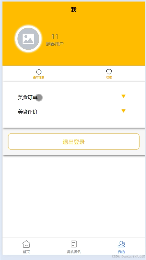 我的: 用户个人中心,包括基本信息管理、收藏的美食、美食订单记录、美食评价等。