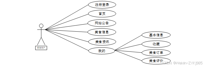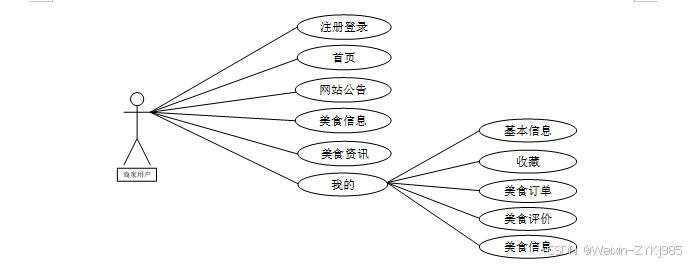 顾客用户角色的用例包括登录注册、首页、网站公告、美食信息、美食资讯、我的(基本信息、收藏、美食订单、美食评价)。