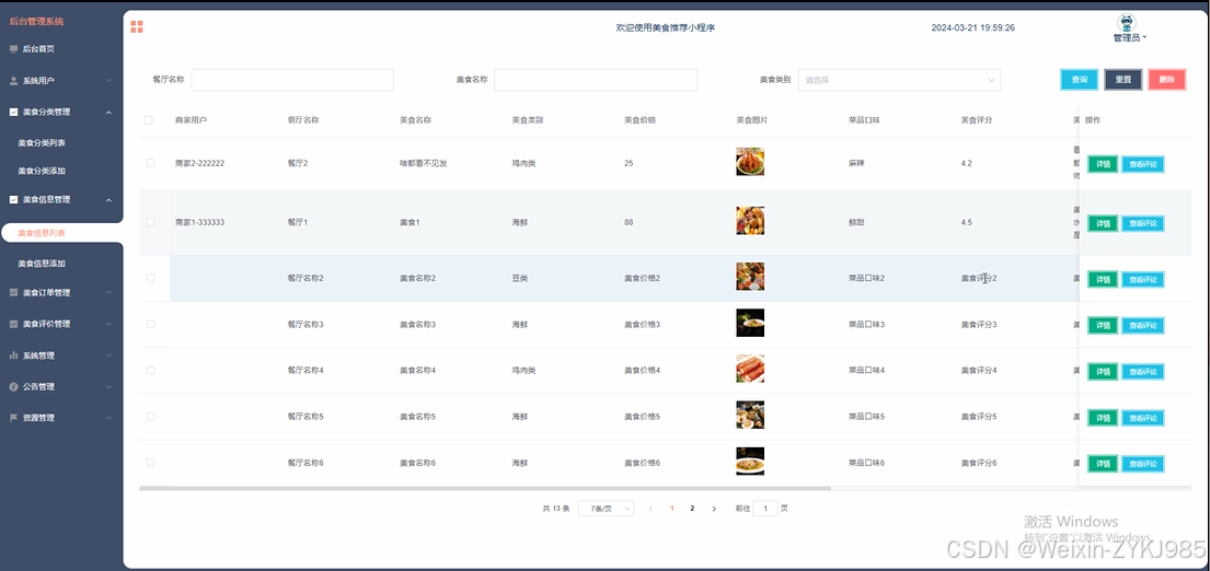 美食信息管理: 管理美食信息,包括审核商家发布的美食信息、编辑、删除等操作。