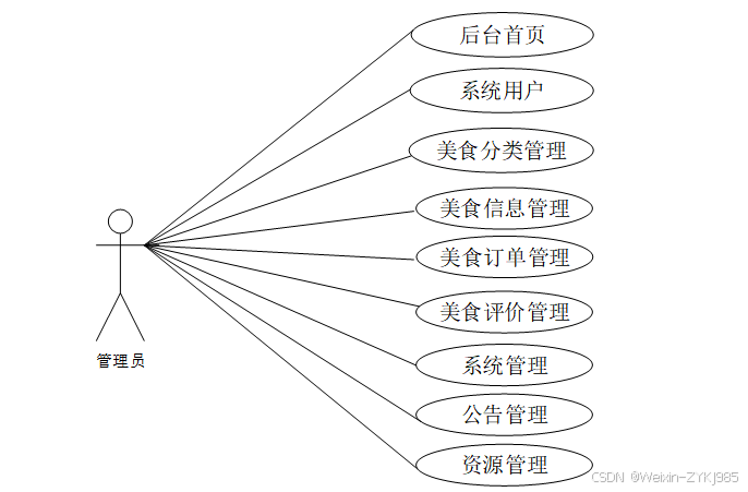 管理员角色的用例包括后台首页、系统用户、美食分类管理、美食信息管理、美食订单管理、美食评价管理、系统管理(轮播图管理)、公告管理、资源管理(美食资讯、资讯分类)。