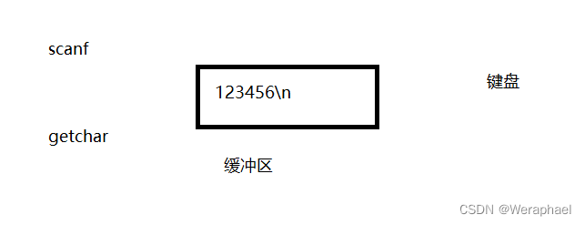 首先先执行scanf函数,我们在键盘上输入了“123456\n”,这些字符串是在缓冲区里的,由于scanf只会读取整型,于是就把“123456”拿走了,此时缓冲区还剩下\n,接着程序就来到请确认密码(Y/N),于是getchar就把\n拿走了,而\n又不等于‘Y’,于是就打印了确认失败。
