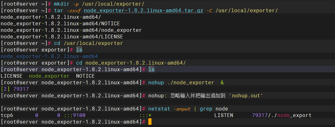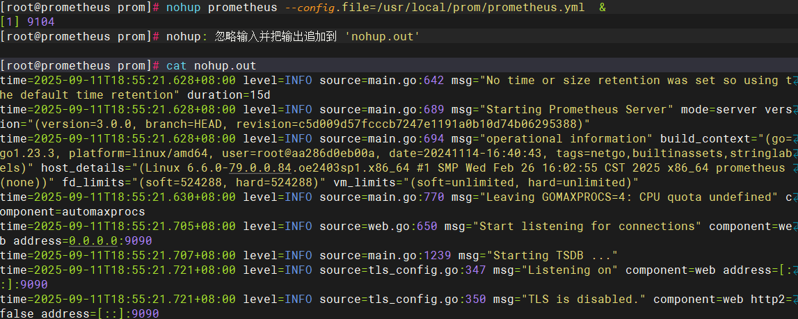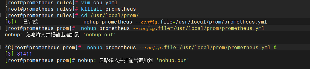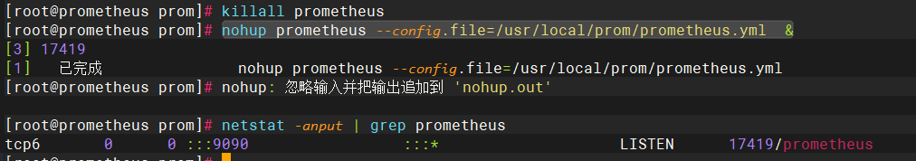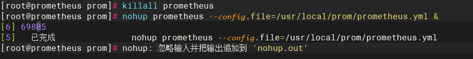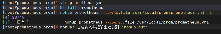 [root@prometheus prom]# nohup prometheus --config.file=/usr/local/prom/prometheus.yml &