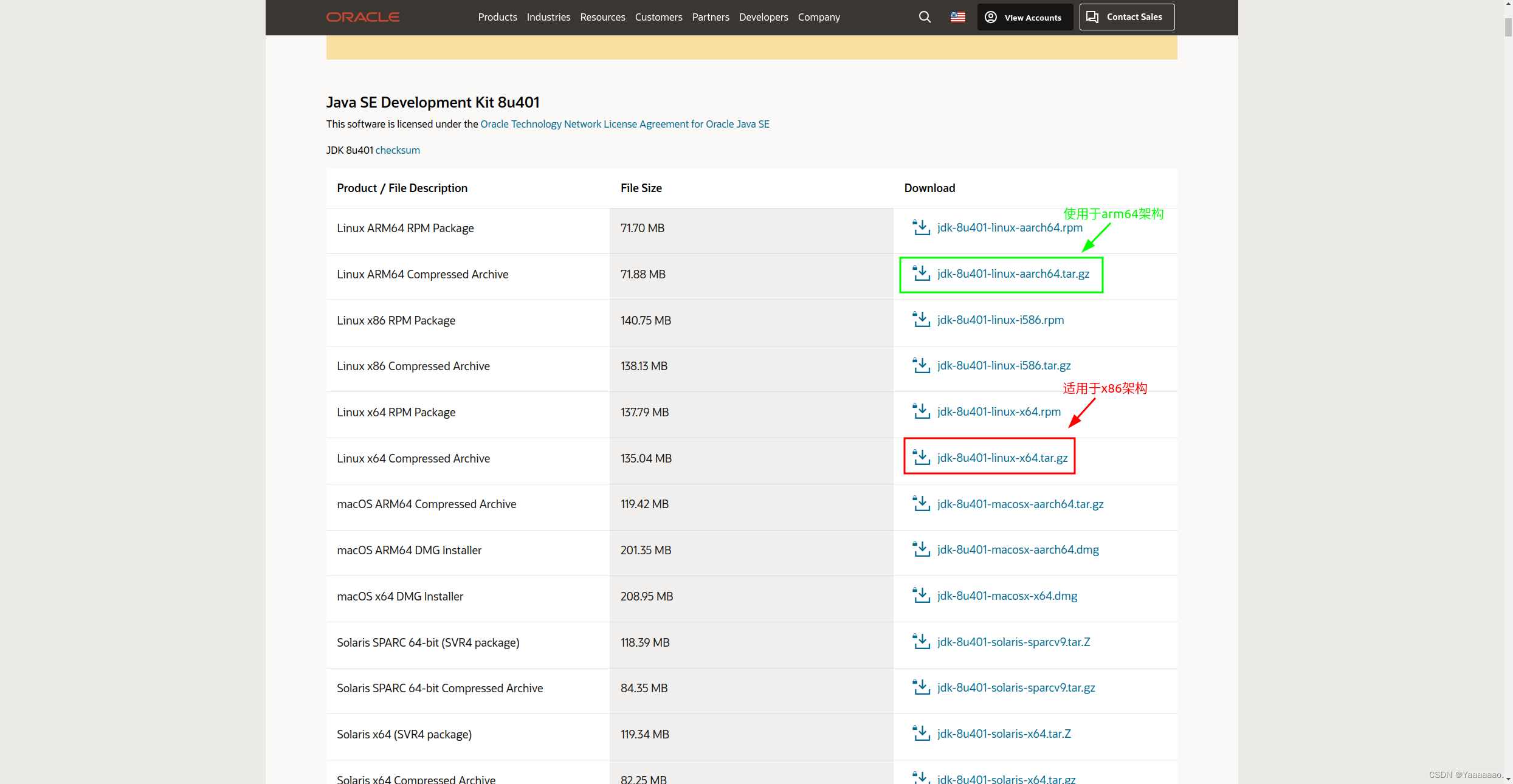 进入页面选择适合系统架构的安装包,绿色框适用于arm64架构,红色框适用于x86架构,这里下载红色框对应的安装包,登录Oracle账号即可进行下载