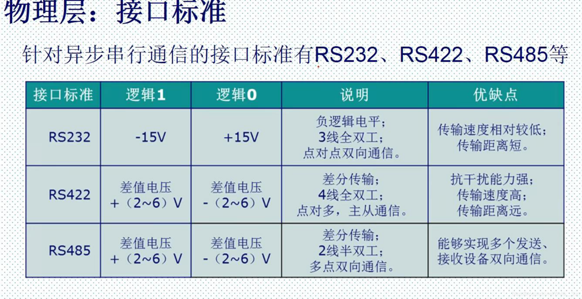RS232:计算机使用,采用负逻辑电平,以数据线电平和地线电平的差值为传输数据 。