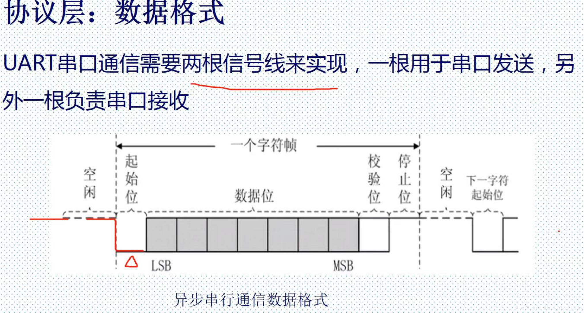 起始位:1位,低电平;数据位:常用8位;校验位:可以是奇校验,也可以是偶校验